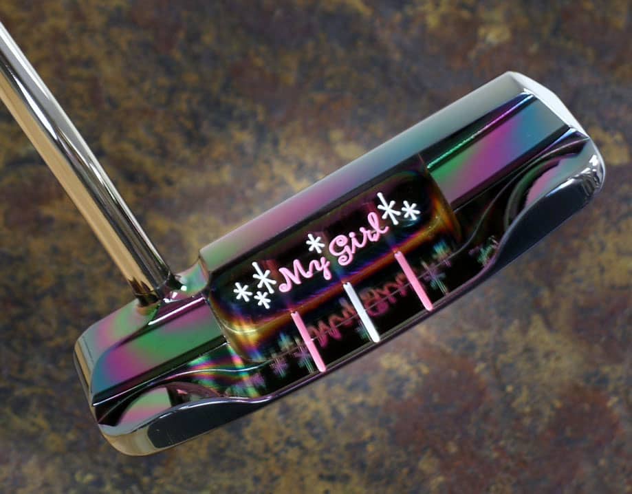 Designed with graceful elegance in mind, the 2006 My Girl™ putter is immaculately accessorized from the ground up. From the lustrous Black Pearl finish to the Black Pearl shaft, complementary shaftband, grip and headcover, everything about this putter shows it’s something special. Based on the design of the Catalina and its predecessor, the Classic X, the 2006 Limited Release My Girl was designed specifically for the ladies. The double bend shaft-over design sets up perfectly for confident, balanced performance. And at 33 inches with a 350g soft carbon steel head, this beauty with its no-hosel design has a sleek look and an even sweeter feel. The Black Pearl finish picks up dancing iridescent rainbow hues in the light and is the perfect palette for the My Girl Cotton Candy Pink and Purple paintfill. Three sight lines in alternating pink and white on the flange assist with alignment. The pink grip, shaftband, and purple suede headcover with For My Girl embroidery complete the exquisite 5th issue Limited Release My Girl putter.